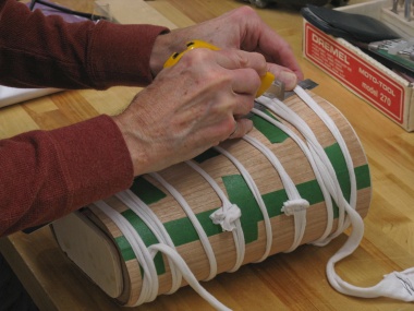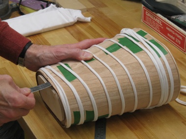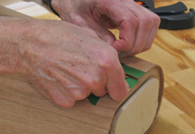 So in preparation for the next layer which was to be horizontal-grained, I wrapped the two veneer pieces on, trimmed the ends as before and taped any gaps or cracks.