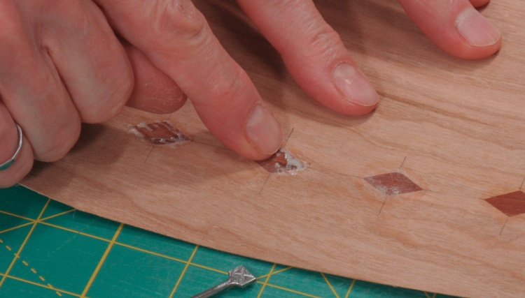 This shot shows me cutting another diamond in a test scrap of cherry veneer. The already-inlaid diamonds look OK in this shot but unfortunately eyes are better than low-resolution snapshots and gaps are visible due to imperfect fit.