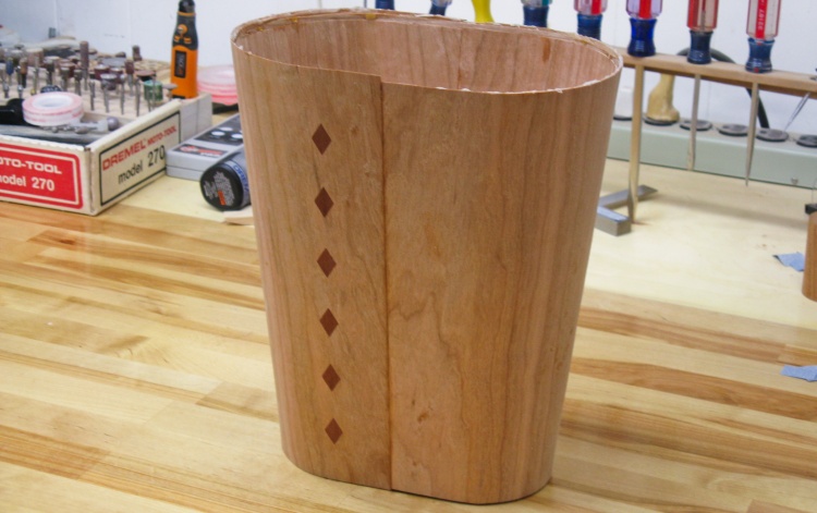 I worried that the plain cherry sides of the wastebasket might be a bit boring so I thought I'd add some decoration to one of the sides. I had in mind a vertical array of contrasting diamonds.
