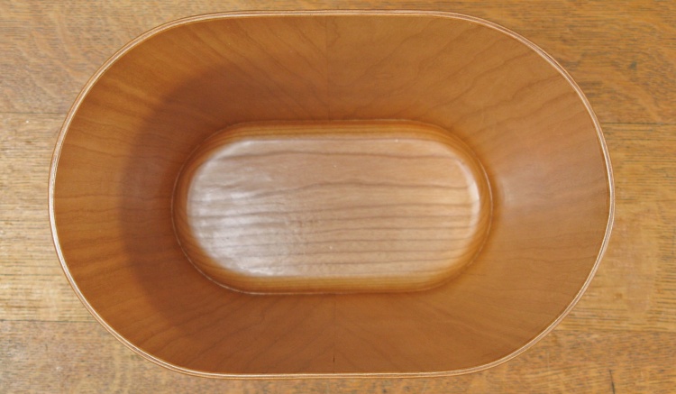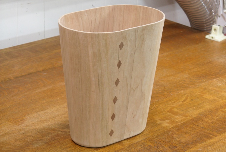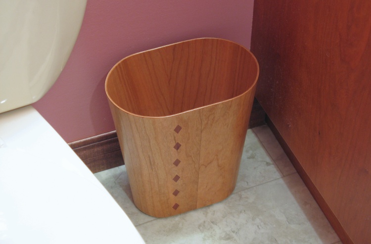 Most wooden wastebaskets (and yes, they seem to exist) are either 4-sided or round, both of which would be easier to make than an oblong version. However, the thinner oval profile takes up less room which in this application was useful.