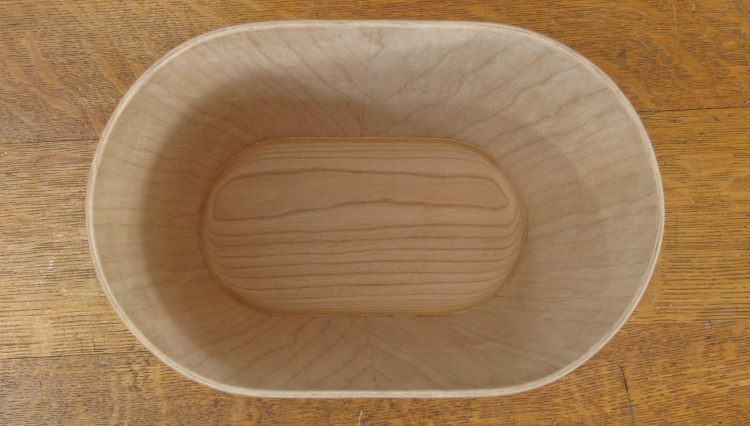 I had originally thought to use solid cherry for the base which would let me give it inside and outside radiuses. However it occurred to me that it should probably be plywood as well to prevent seasonal expansion from cracking the veneer walls. I wanted the visible grain oriented the long way and for minimal warpage the plywood should have a symmetrical top-to-bottom structure. I didn't quite achieve perfect symmetry but at least the grain orientation is what I wanted.
