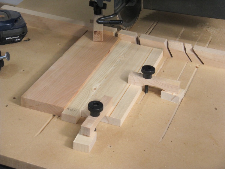 Like the one on the right side of the photo, these are simple hold-downs consisting of a screw threaded into the saw table along with a wooden toggle that gets tightened down with a threaded knob.