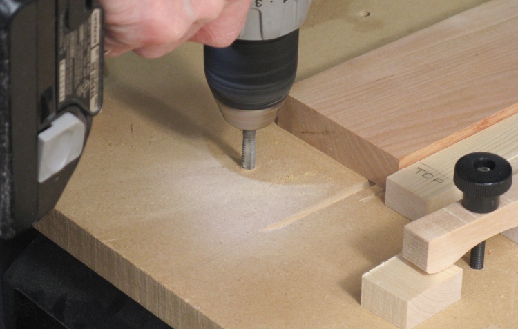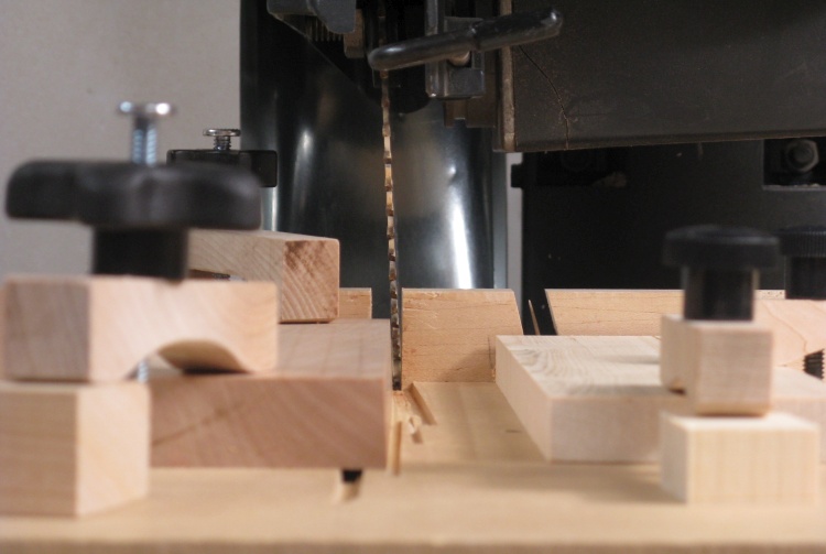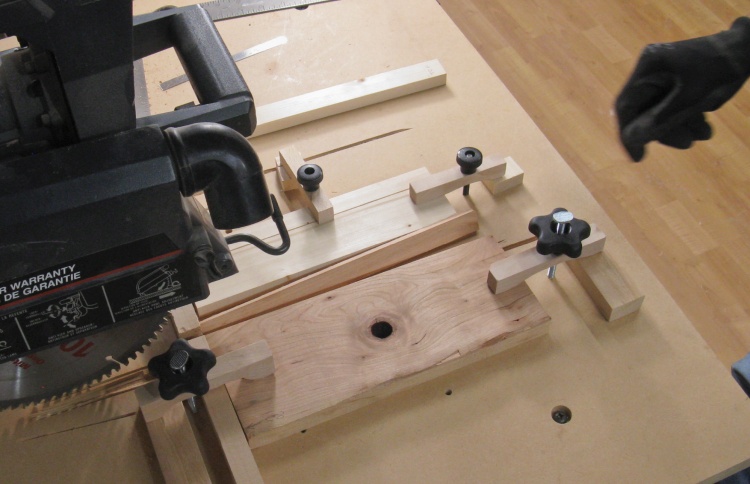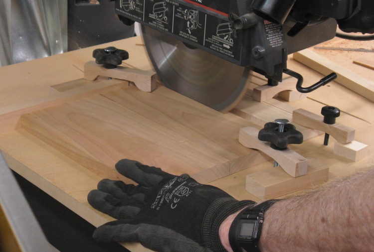 This shot shows the complete setup. The spacer to the right of the Cherry piece is set in place while the Cherry is snuggled up to it and the clamps are tightened, then the spacer is removed before the cut is made. This allows the cut piece to fall away from the blade on the return stroke to prevent marring.