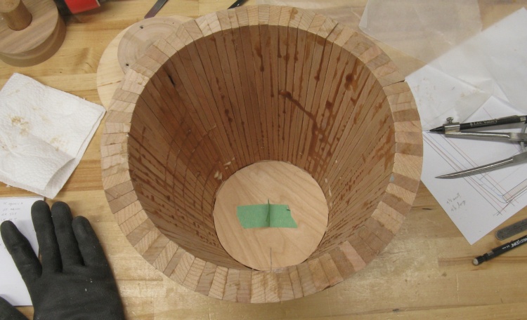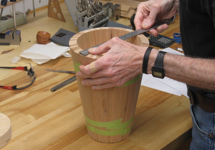 The diameter looked kind of small and the ruler agreed. I'm not sure what exactly happened since the staves seemed to be the correct size but ultimately both top and bottom diameters were about 0.6" smaller than I was aiming for.
