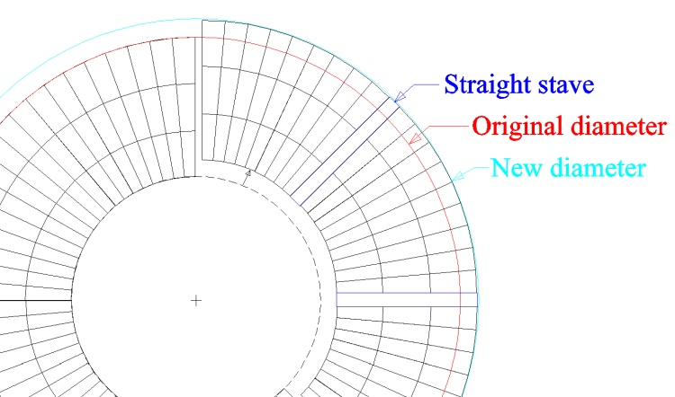 After some fiddling with the drawing I decided the best solution was to just insert some extra staves periodically to move the diameter out to what I wanted. Using non-tapered staves would increase both top and bottom diameters by the same amount which was exactly what was needed. As a bonus, the straight-sided staves should be pretty easy to make.