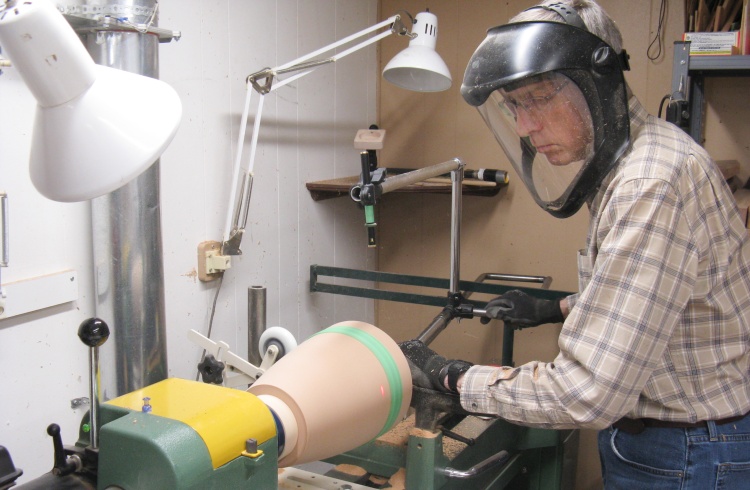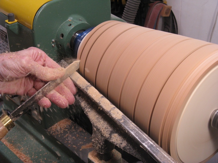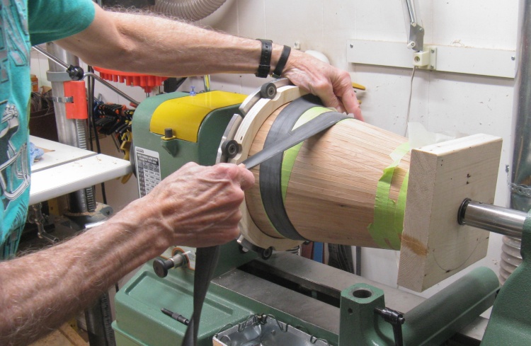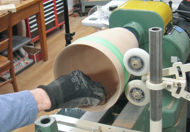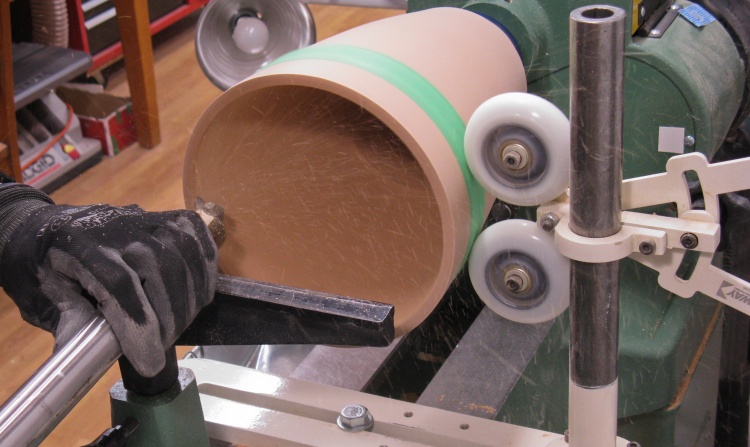 The green ring around the vessel is a strip of taped-on plastic that prevents the stabilizing wheels from indenting the wood.