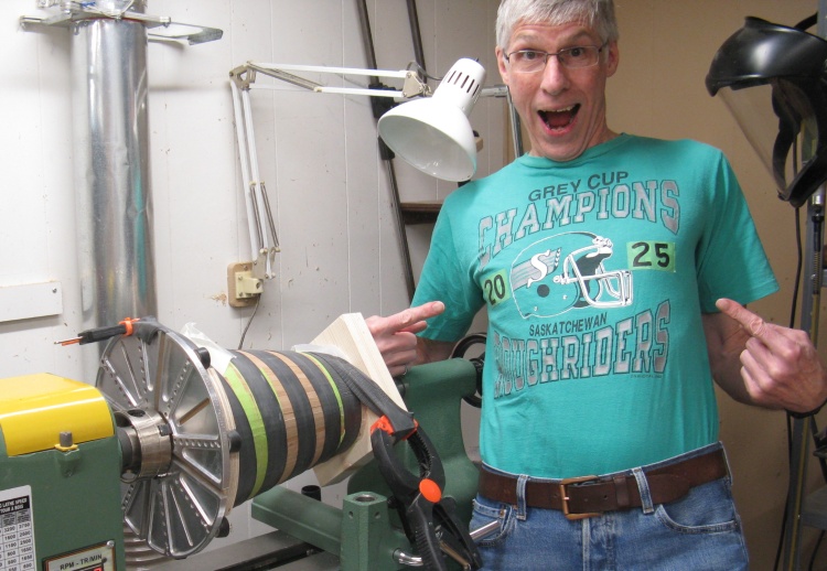 Upon drying of the wood glue, a faceplate was added and the base was cut roundish on the band saw and then made perfectly round through the good offices of this large scraper in combination with the magic of circular symmetry.
