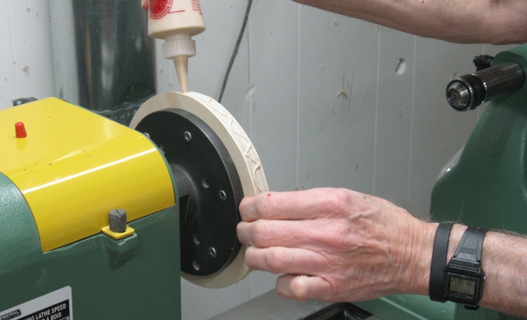 Once a close fit was achieved, the bottom went back on the lathe and its edges received a generous coating of glue.