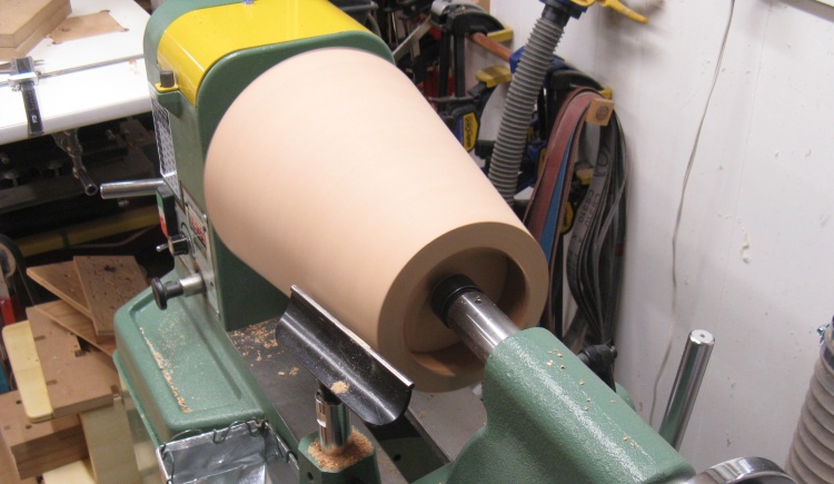 The cover is equipped with a faceplate to allow turning of the wastebasket for the first phase of the lathe work.