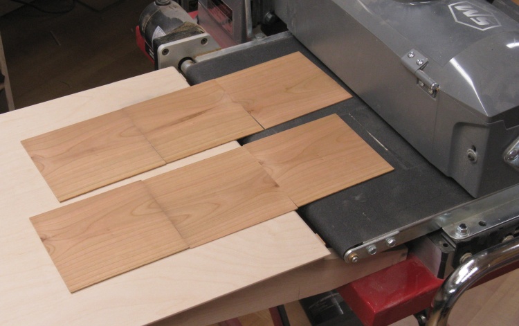 The 5 plys (plus a spare) were run through the drum sander numerous times to get both sides flat and smooth, ending up at around 0.063" thick.