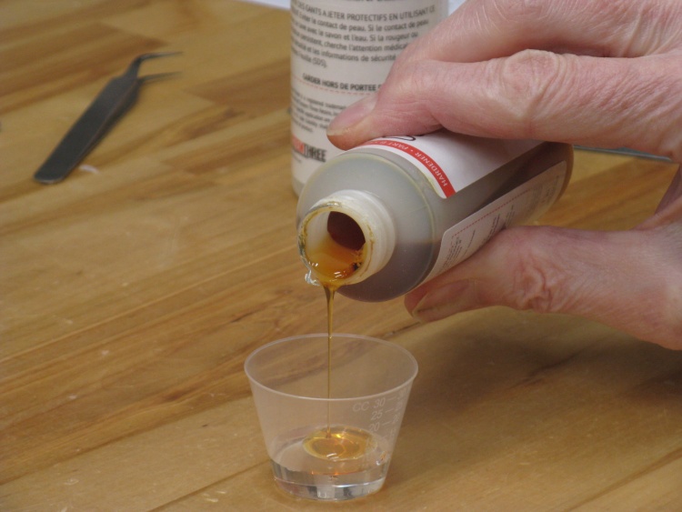 I used a slow-set epoxy to give me enough time to spread it on four surfaces and set up the clamping. I aimed for 0.004"-thick epoxy layers which worked out to about 7 ml of epoxy required and here I'm pouring the hardener into the resin before giving it a good stir.