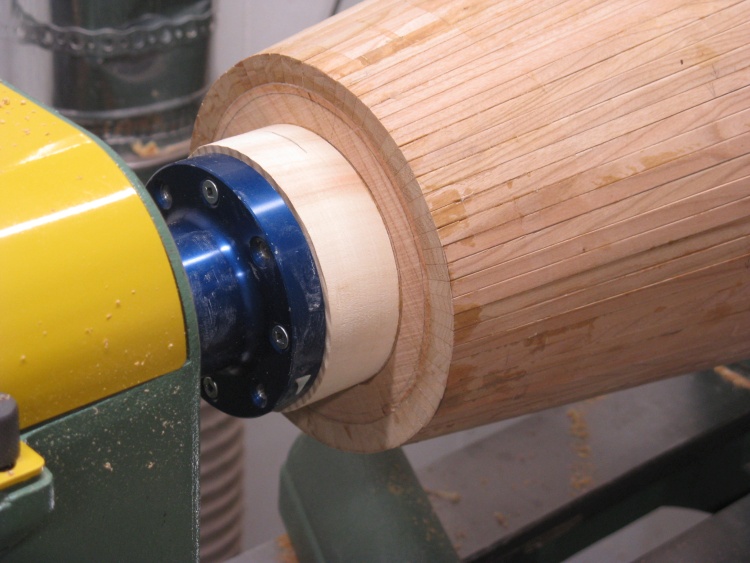 The base would be held at the tailstock end so I needed a smaller-diameter ring that could press-fit over the live center. I just used a piece of construction 4x6 with a hole for the live center in one face and the circular slot for the staves in the other.