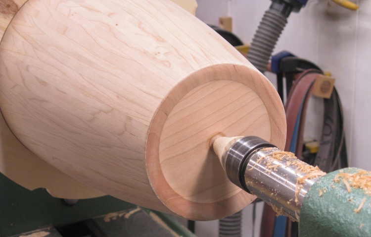 This shows the tailstock pushing on the temporary bottom. Just ignore the fact that the body is spinning in this shot...
