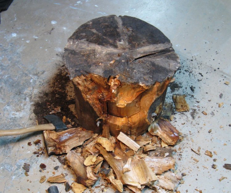 And sure enough there was "some other problem". I was thinking that I would chop off some of the wider parts, but the first blow of the hatchet knocked off a big chunk and further chops showed that the wood was already well-rotted. Fine for termites, but wood turning? Not so much.