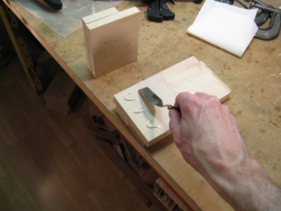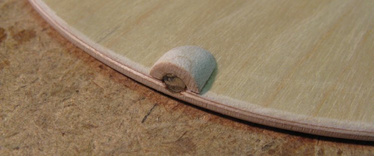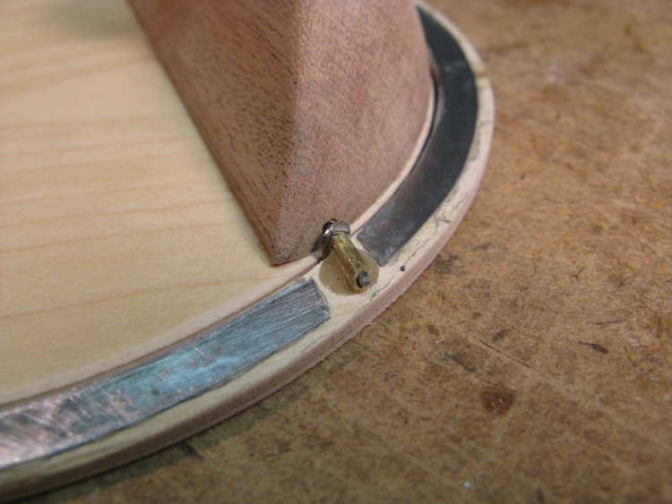 Here the counterweight is being glued to the cover. There is a notch on the bottom side of the counterweight to house a hinge rod, as well as short sections of brass tubing at the edges to ensure a good fit of the rod.