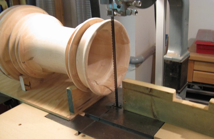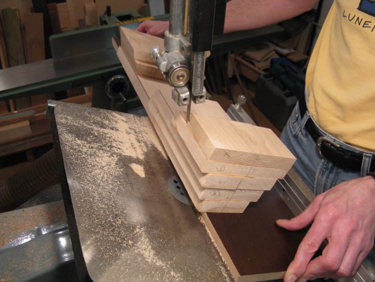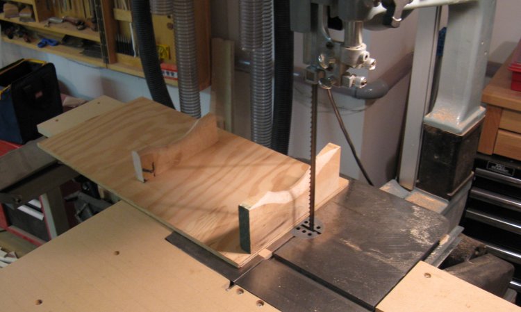 I made a simple jig to aid in cutting the sides. This was just a spare piece of MDF shelf screwed to the assembly. The shelf sat against the rip fence of the bandsaw to maintain a fixed distance for a straight cut.
