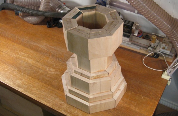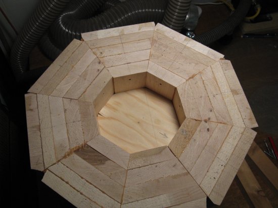 This shows the various pieces and how they stack up to form the sections. One advantage of plan B is that much less has to be cut out of the center. Making such a large and deep hole in a solid log would have been a challenge.