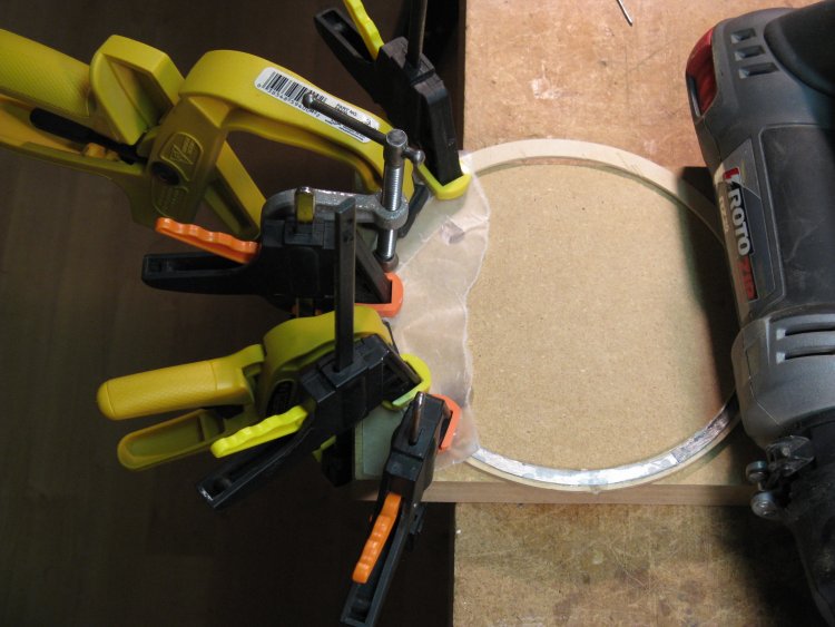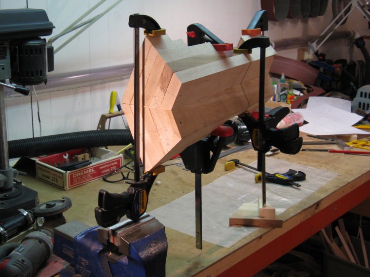 One of the metal pieces is being glued on in this shot. Each piece was trimmed to fit and then epoxied in place. The large number of clamps is to ensure the metal sits flat along its length while the glue sets.