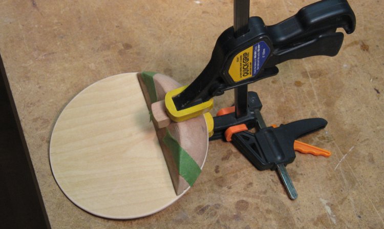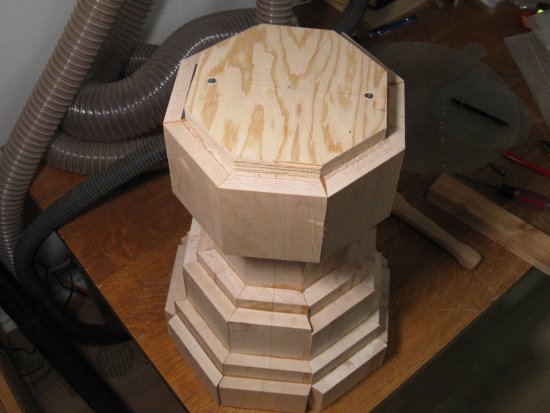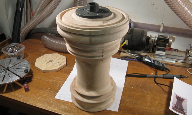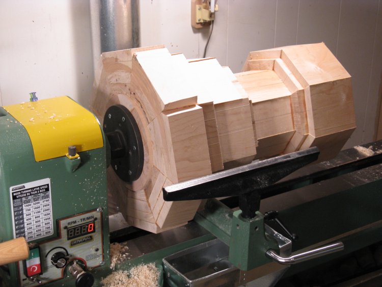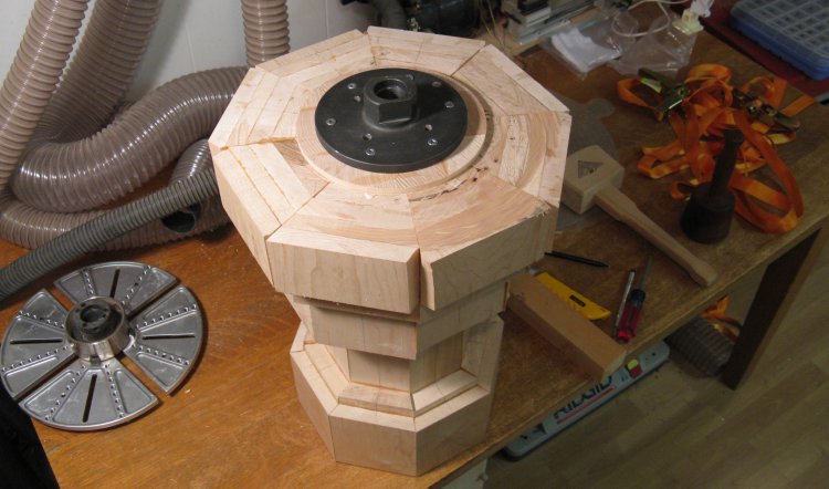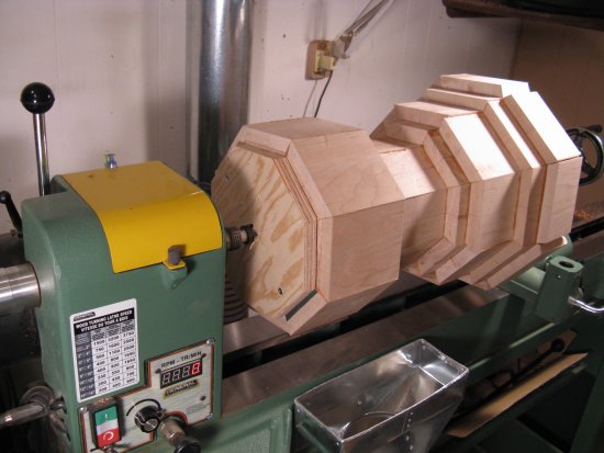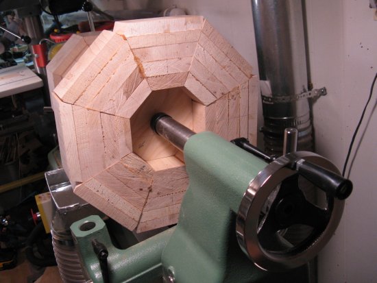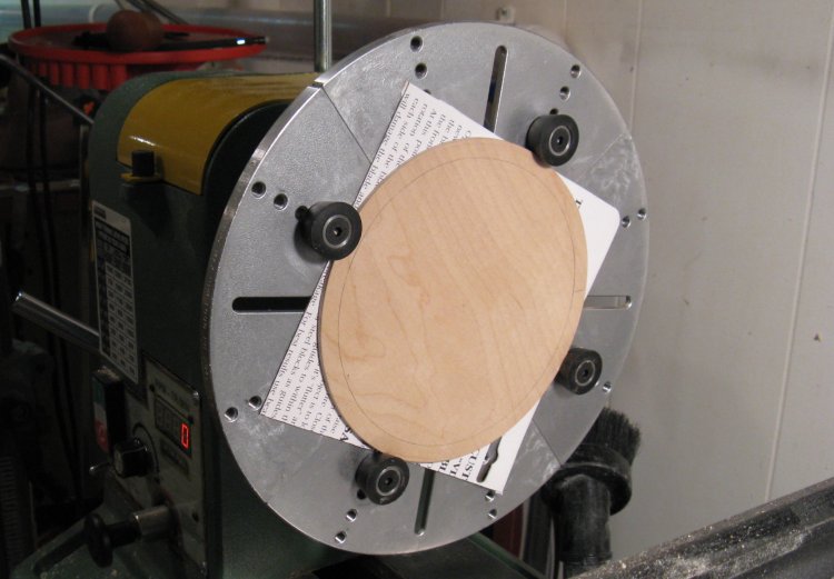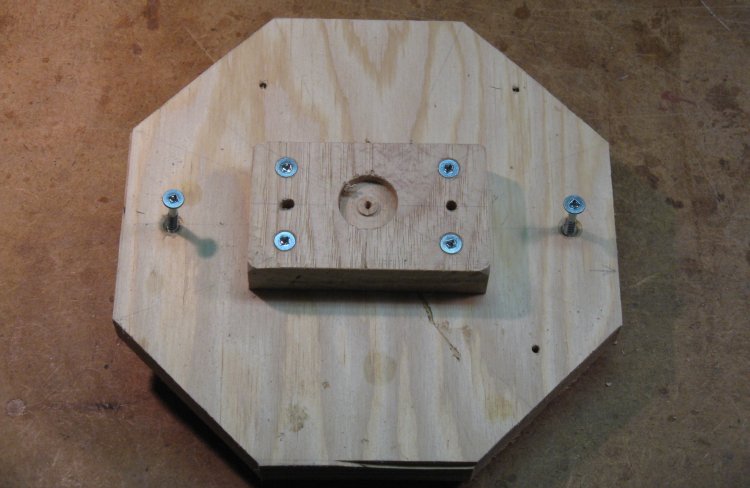However to do that, I needed to mount the piece on the lathe to cut the recess. To give gripping surfaces, I make a rough octagonal "false bottom" plywood plug and screwed a larger plate on to the top.