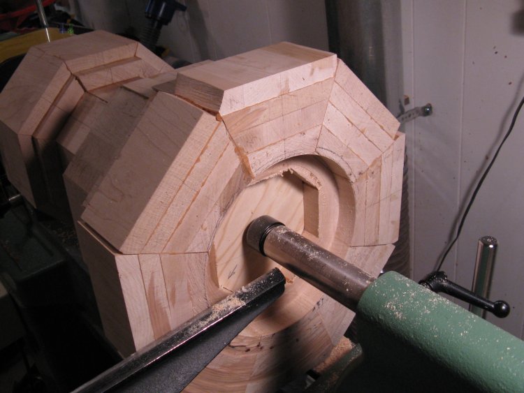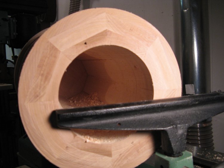 Here I've started cutting the interior to a round shape. I used a "deep hollowing tool" for this, which is handled steel tool that is 26" long with a ring-shaped cutter at the end. Unfortunately, the depth seen in this shot is as far as I could go with the cutter.