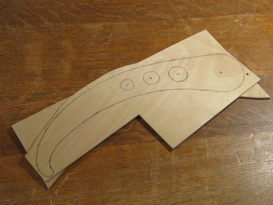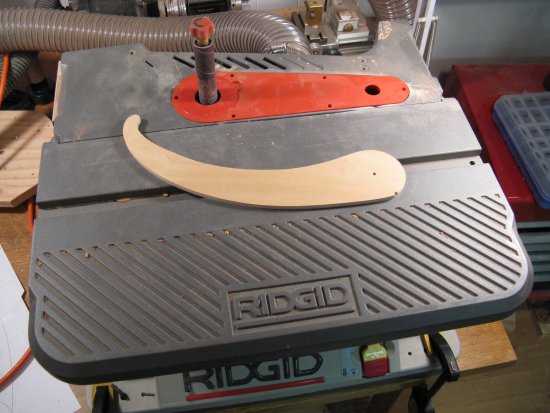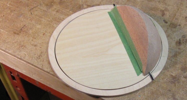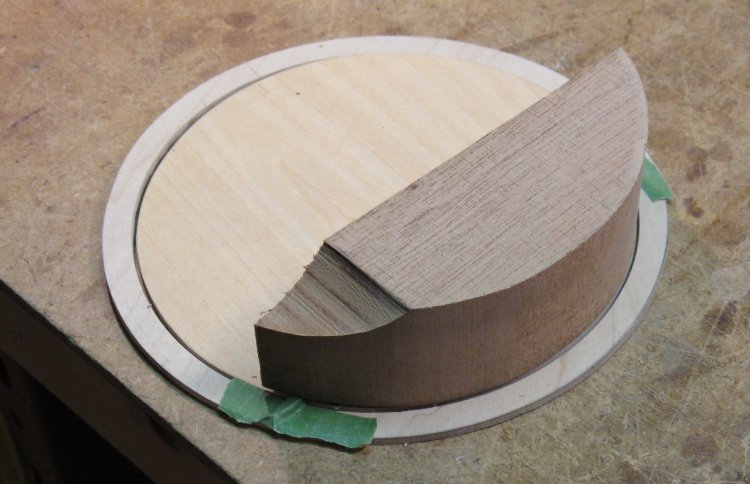 This the blank I started with for the counterweight. I didn't find any especially heavy woods around the shop (that I wanted to sacrifice for a counterweight anyway) so I just used the piece of mahogany shown here which so far has been cut and sanded to the round contour of the cover.