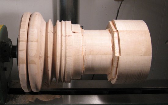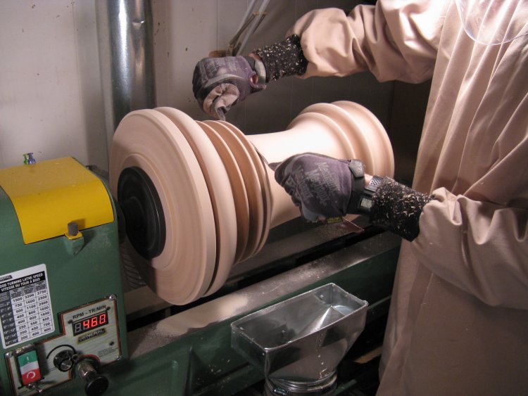 The above photos show the piece mounted between the drive spindle at the motor end and the live center on the other (tail-stock) end on the lathe. The live center can be screwed forward with the crank on the tailstock to apply pressure on the piece and push it into the drive spindle.