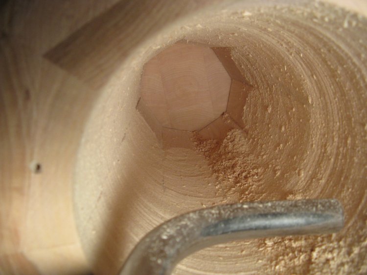 This shot shows the interior rounding having progressed a bit deeper. I finished off all the way to the bottom with the new tool. I'll note that it would certainly have benefited from a stiffer shaft, but I managed to complete the hollowing as it was if a little rougher than desired.