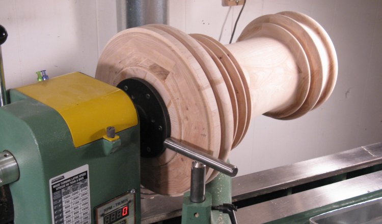 Anyways, here it is mounted on the lathe. I'm using a 16" lathe which means the spindle is 8" above the bed. It can therefore turn something up to 16" in diameter and here there's just over an inch of clearance to the bed. The wood wouldn't hit, but it prevented the tool rest clamp from being positioned under the biggest part. That wasn't much of a problem and as you can see the tool rest mount is just beside the largest-diameter part.