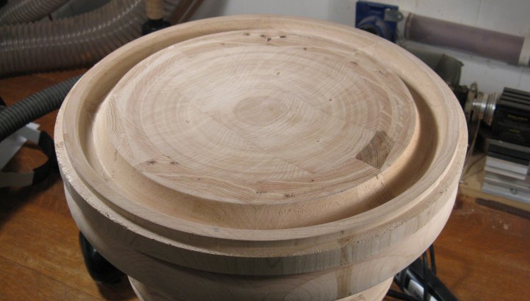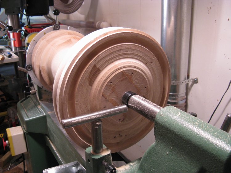 Here the bottom has had the lathe mounting plate screwed securely to it with six stout #10 screws since it will eventually need to support the full weight of the wastebasket hanging off the end.
