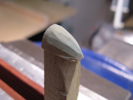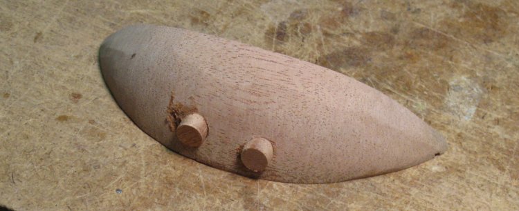 The protruding bottom piece has been trimmed away and the center has been given a concave shape to reduce weight. There's just the little center nub remaining to be cut off and sanded smooth.