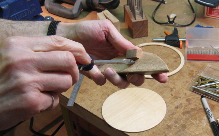 Here the bottom with mounting plate has been attached to the main piece with glue and the gentle aid of some of the mallets in the background.