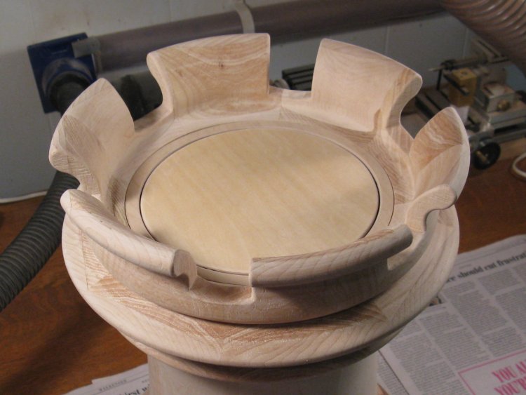 Before the spindle chewed all the way through the plywood I pulled the piece off the lathe and added a small plate made of of oak to the top. Even so by the time I was finished, the spindle had managed to dig down a noticeable amount (aided by my regular tightening of the tailstock to keep everything secure).