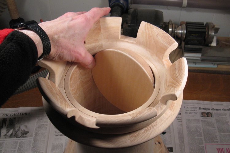 It was mounted to the lathe, the face was turned flat and the diameter adjusted to fit snugly into the recess cut in the bottom of the wastebasket.
