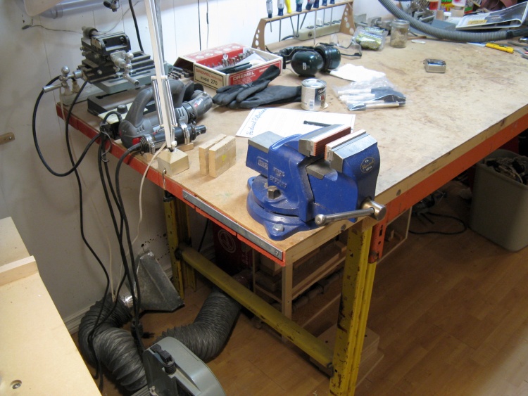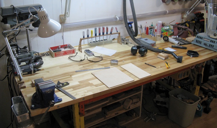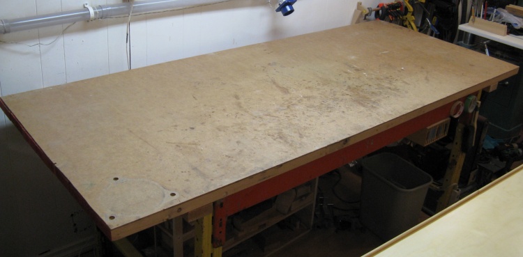 In the basement shop is a large workbench which is used for pretty much everything including woodworking, plus a smaller solid oak table primarily for woodworking. I'd like to have an "official" woodworking bench with the proper vises, dog holes, etc., but I couldn't give up my big bench since it is too darned handy, and the size and height of my table has been pretty useful too. Since those are "keepers" and I don't have anything like enough room for a third bench, I decided just to replace the aging top on my main bench to be more woodworking-y. The current top has worked well for 30 years, but the surface is flaking off and isn't particularly flat, so it seemed like a reasonable candidate for replacement with something nicer.
