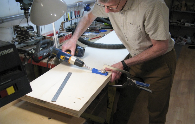 The plan was to glue and screw the plywood portion to the laminated portion. Here I'm using the blue jig to drill pocket holes in the plywood so I can drive screws in at an angle.