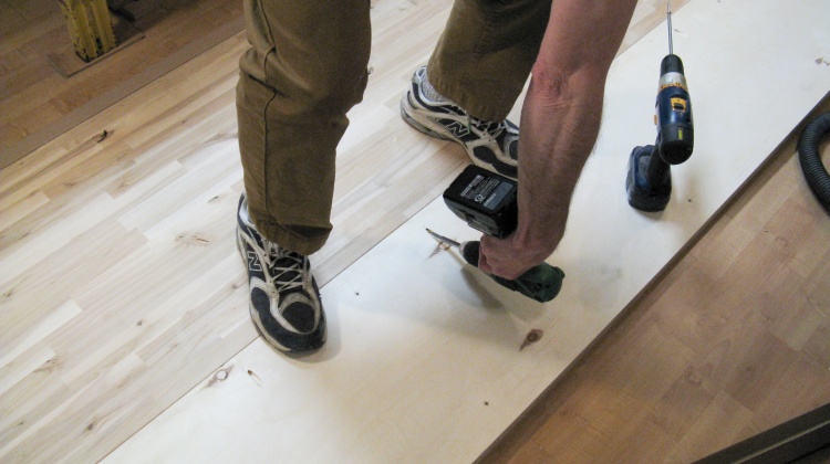 My first attempt to attach the pieces involved me standing on the joint as I inserted the screws. My reasoning was that the top side of the two pieces would be flush since I was standing on them, pushing them into the floor.