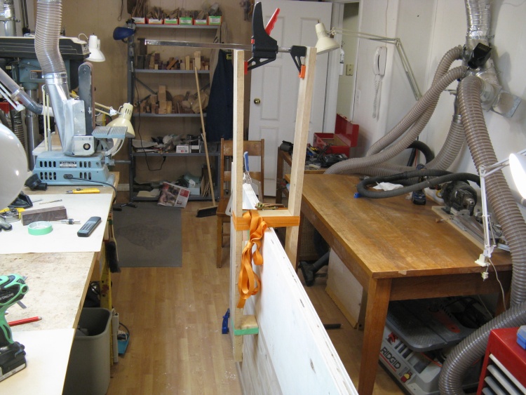 So then I redrilled the pocket holes, making sure there was some slop fine adjustability in the holes. And then I kludged together this big offset clamp thing that allowed me to force the pieces into alignment (against some residual warp) near each screw before tightening the screw down. This rather involved process seemed to work fine, fortunately.
