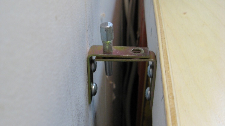 To reduce the wobbling of the bench when I'm doing something like sawing or planing, I attached it to the wall in two places with a couple L-brackets and a pin fashioned from a bolt.