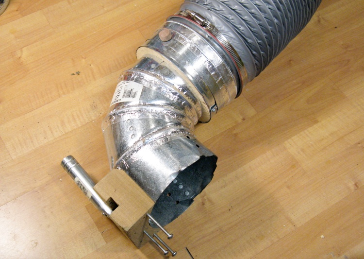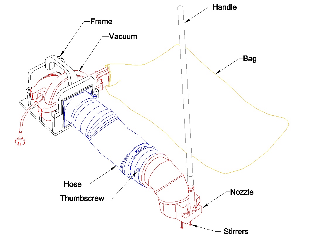 The hose assembly is attached magnetically to the frame and a pair of thumbscrews (not installed in this photo) holds the nozzle to the hose assembly. This new nozzle has a smaller area than the original square model which gives a bit faster airflow for better debris pickup.