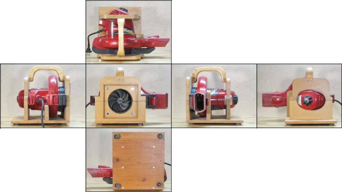 The Toro unit first underwent a handle-ectomy where the rather large handle/knob assembly was sawn off. The more-compact body was then mounted in a convenient rubber-footed frame with a carrying handle.