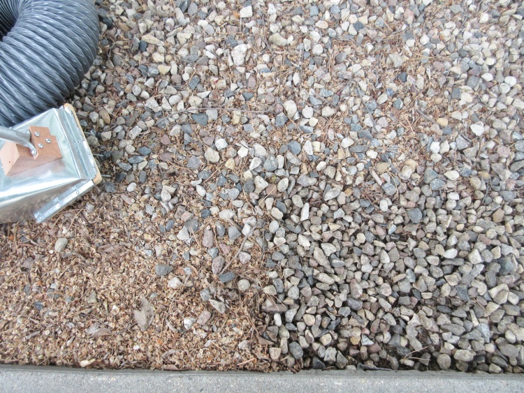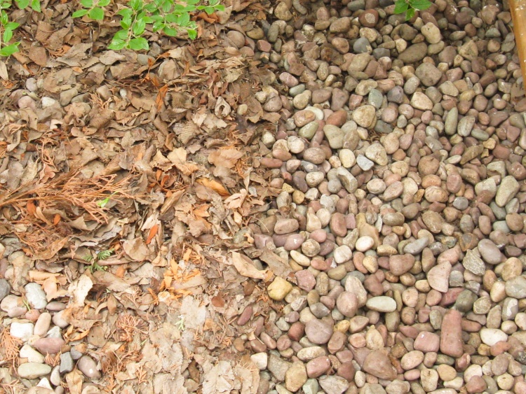 The gravel accumulates lots of debris right next to the driveway and a lighter dusting throughout the rest of the bed. This shot next to the driveway shows cleaned gravel in the lower-right corner with "to-be-done" sections elsewhere.