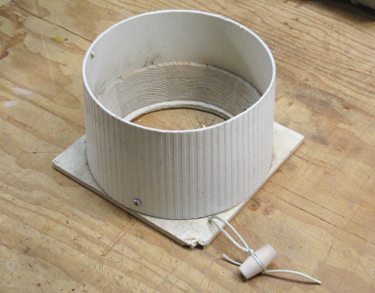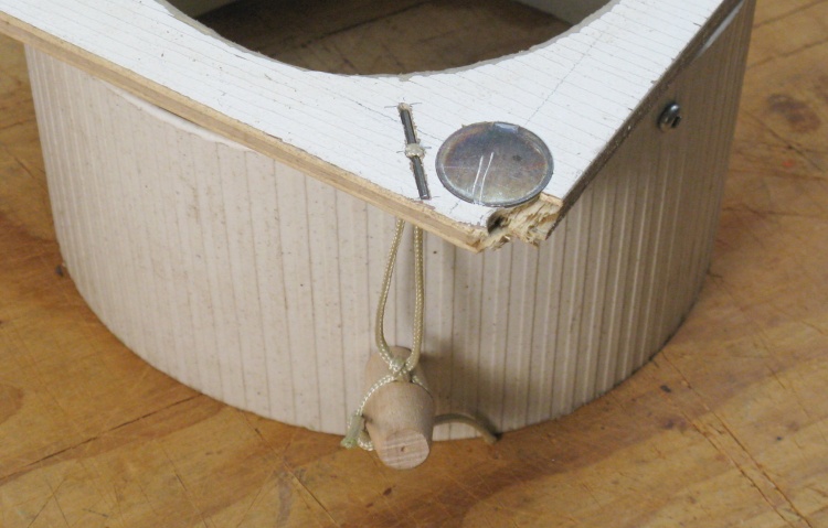 This shows the metal rod (remarkably similar to the center portion of a 1.5" finishing nail) that anchors the new cord pull on the back of the plywood faceplate. The nearby broken corner was where the screwed-on pull knob used to reside.