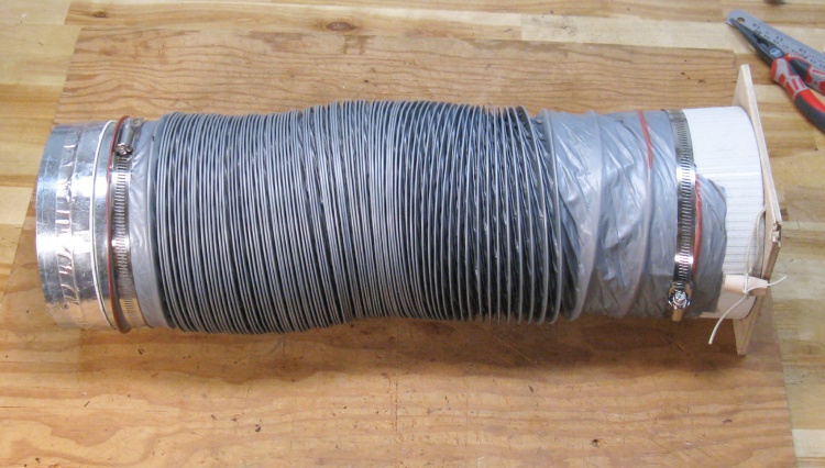 This photo shows the base-unit end of the hose assembly with the new toggle and cord attached. The tube (OK, a piece of a plant pot) is a durable barrier for debris thrown by the impeller.
