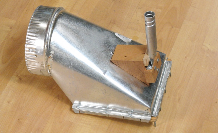This shows the nozzle attached to the hose assembly. It slides inside and is held with two thumbscrews (with wooden heads, natch) that go through matching holes into a captive nut in the nozzle. Only one of the thumbscrews is visible in this shot.